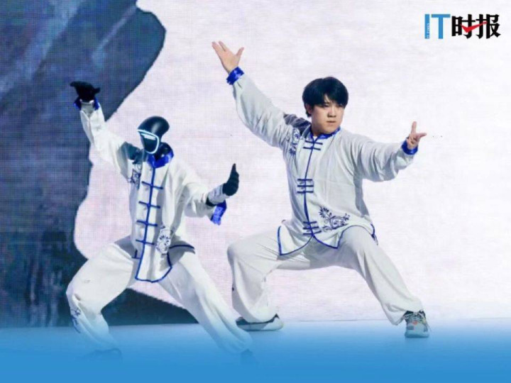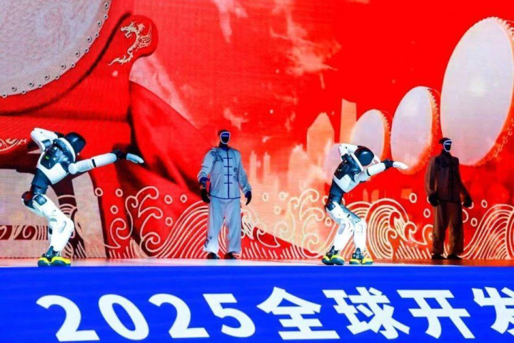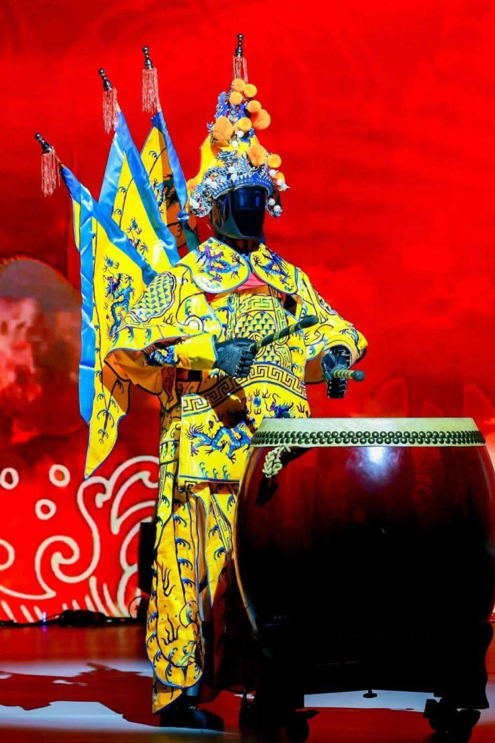 12月13日举行的全球开发者先锋大会暨国际具身智能技能大赛(GDPS2025)开幕式上,智元远征A2身披一身中国京剧武生行头,背插四面“靠旗”,挥动着鼓槌敲击大鼓,而舞台上的两台智元灵犀X2则配合着鼓点,做出“眨眼”“抖毛”“探头”等动作。表演远不止这些,身着白色太极服的宇树G1,与人类武术演员并肩站立,打起了太极……